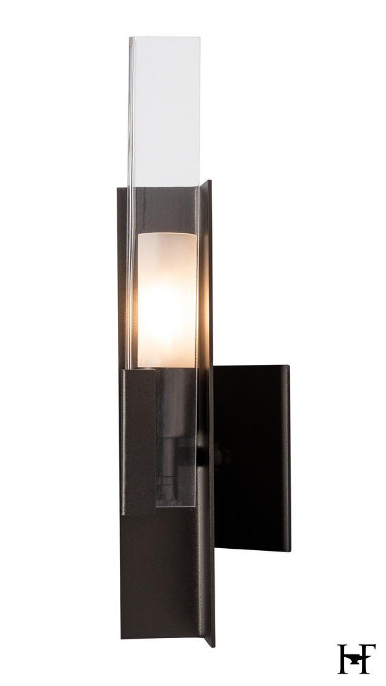A classic design with a contemporary feel, two right angles that embrace to shield the light within, the Summit Sconce features steel that is bent to 90º that holds a glass element that is shaped to the same angle. A frosted cylinder of light is centered between the two, creating a stunning effect.