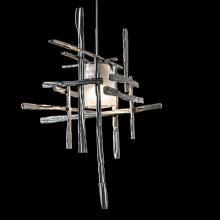 The Tura Mini Pendant with Frosted Glass features perpendicular, intersecting, handcrafted pieces of annealed aluminum that form an exoskeleton surrounding a frosted glass shade. Suspended from a small round canopy, electricity is delivered via the pendant's low voltage cable. Available in all standard finishes.