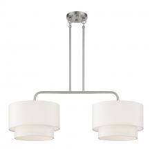 The Manorwood collection has a clean, crisp look and modern appeal. The hand-crafted off white colored fabric hardback double drum shades offer a diffused warm light complementing the soft gold finish on this sleek two light linear chandelier. Will adapt well in the living room, dining room and over the kitchen island tastefully elevating your style.