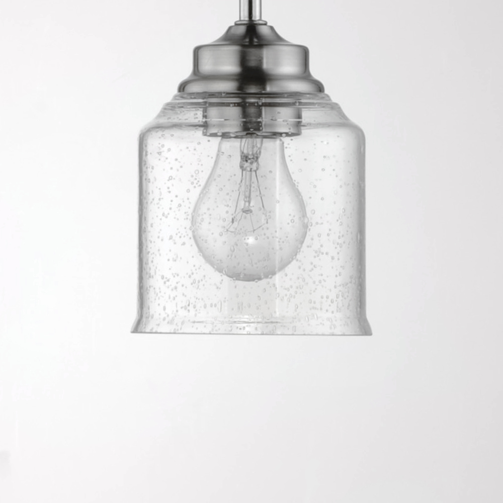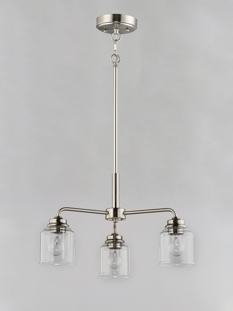 A modest frame of steel tubing gently bends to support a cluster of Clear Seedy bell-shaped glass. Similarly the bobeches and other metal accents echo that traditional bell shape creating an instant classic. An easy choice with transitional appeal, choose