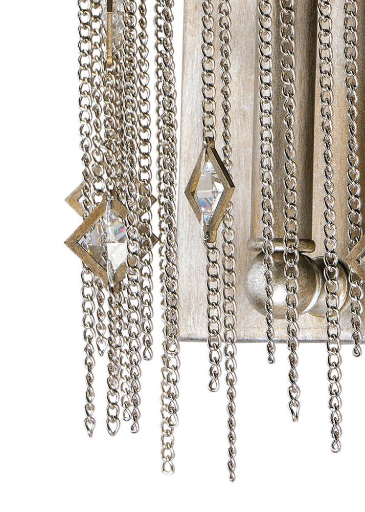 Diamond shape crystals float in a web of jewelry grade chain supported by a metal frame finished in in our exotic Silver Mist. Each fixture is delicately draped by hand from skilled artisans to create these original lighting art forms.