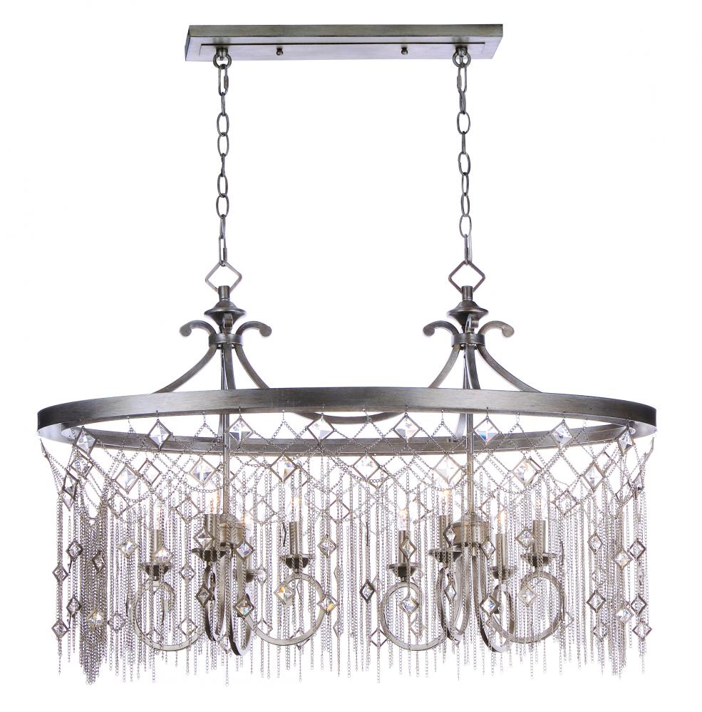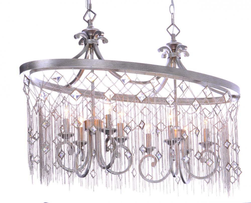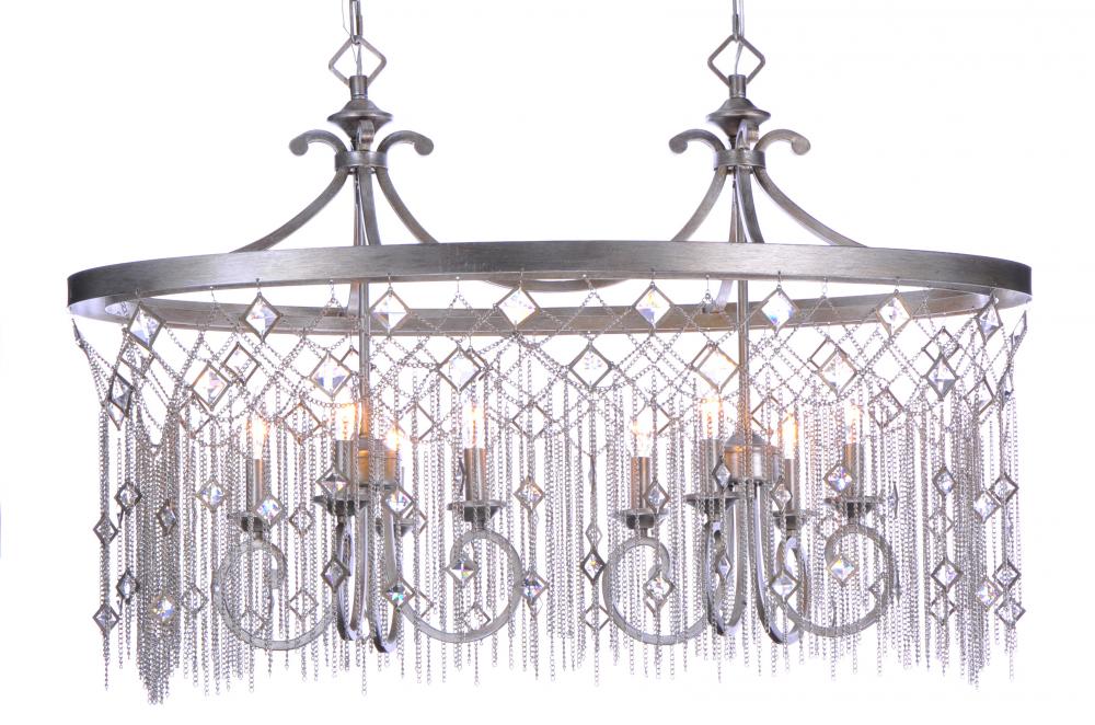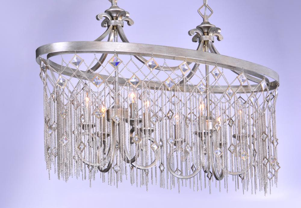 Diamond shape crystals float in a web of jewelry grade chain supported by a metal frame finished in in our exotic Silver Mist. Each fixture is delicately draped by hand from skilled artisans to create these original lighting art forms.