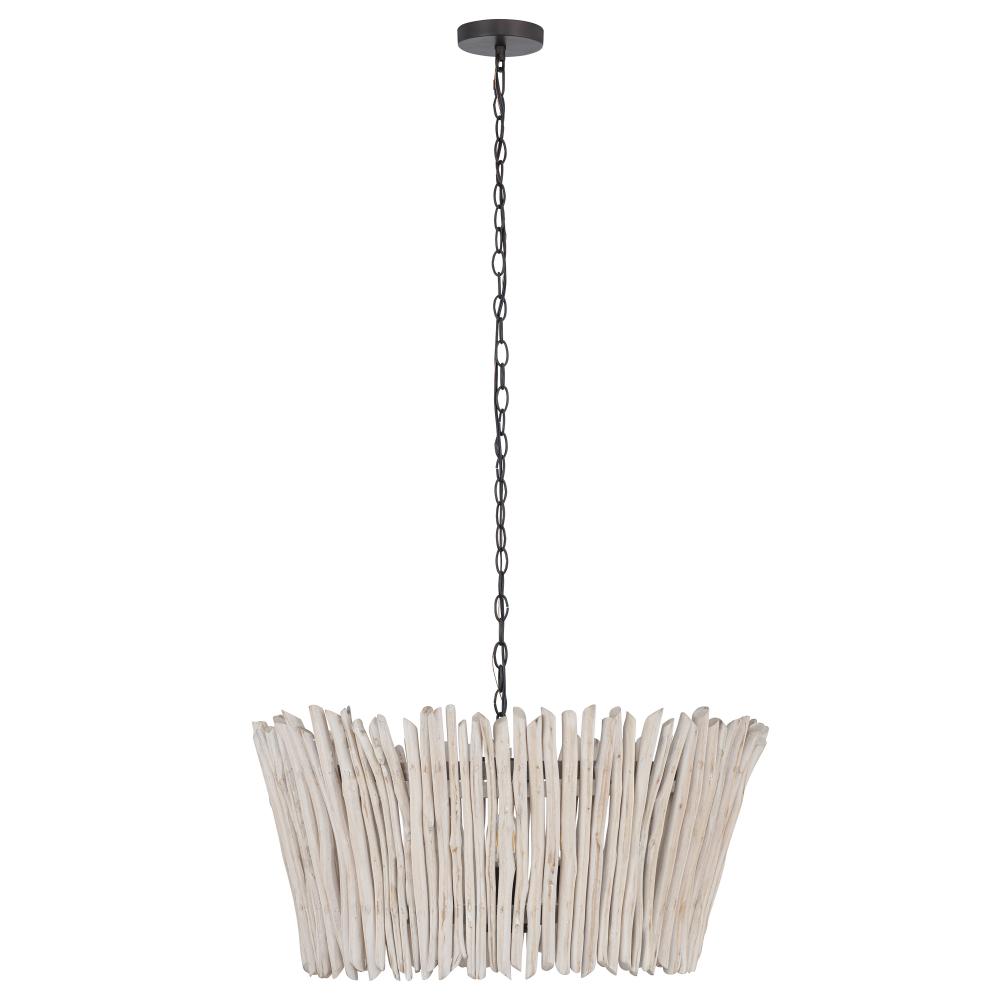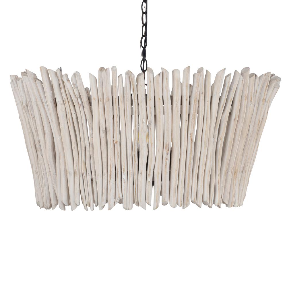 Staggered branches of eucalyptus are meticulously linked together to form a tapered bouquet shade, showcasing exceptional handcraftsmanship. Each branch is individually shaped, with the wood finished in a hand-applied Weathered White that beautifully compl