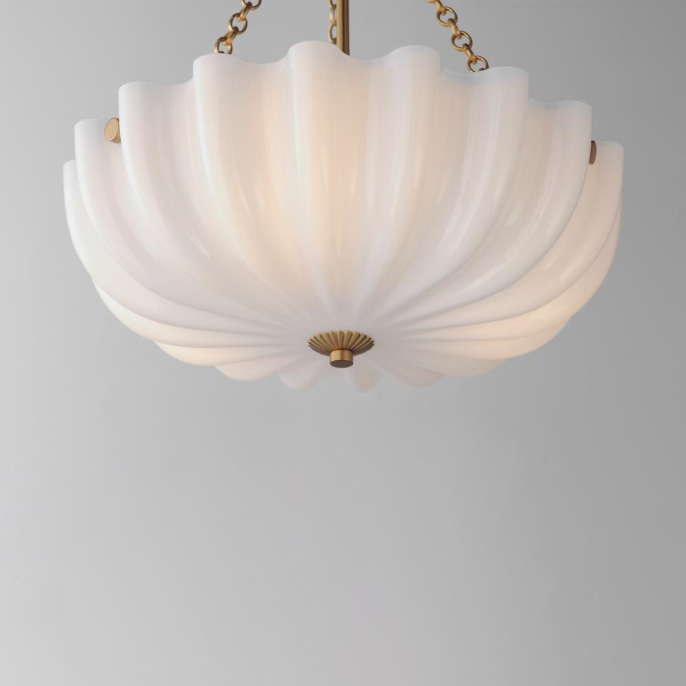 With glossy opal white glass shades, this collection brings a graceful, feminine touch to the inverted bowl design inspired by the shape of a bundt cake. Suspended by a decorative circular ring chain, the shade features an acrylic dust cover that encloses