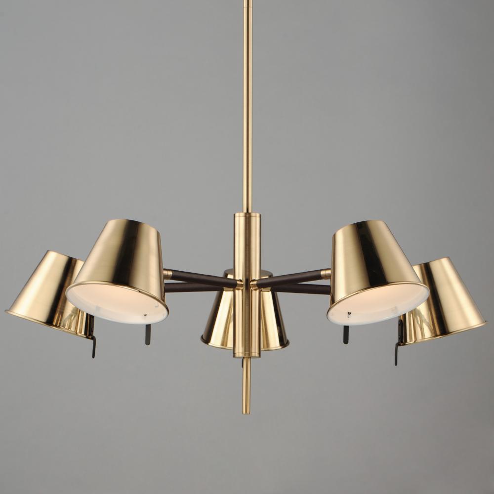 Metal shades finished in a warm Heritage Brass are accented with Dark Bronze metal straps and Tobacco Brown leather wrapped details. Recessed within the metal shades, a frosted glass diffuser softly casts the LED light source within. Paddles on every shade