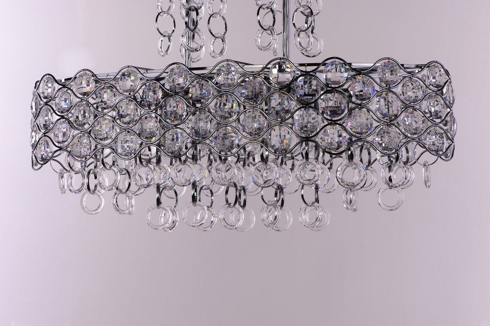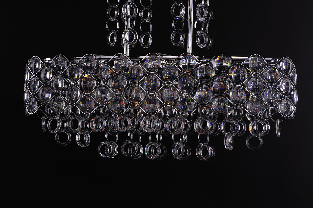 Chains of faceted crystal rings are linked together by Polished Chrome jewelry bands that cascade from the top and through the fixture. The exterior shade of wave-like metal encases multi-faceted Beveled Crystal jewels, which sparkle from the light of the