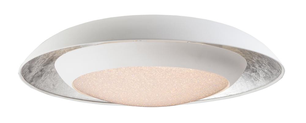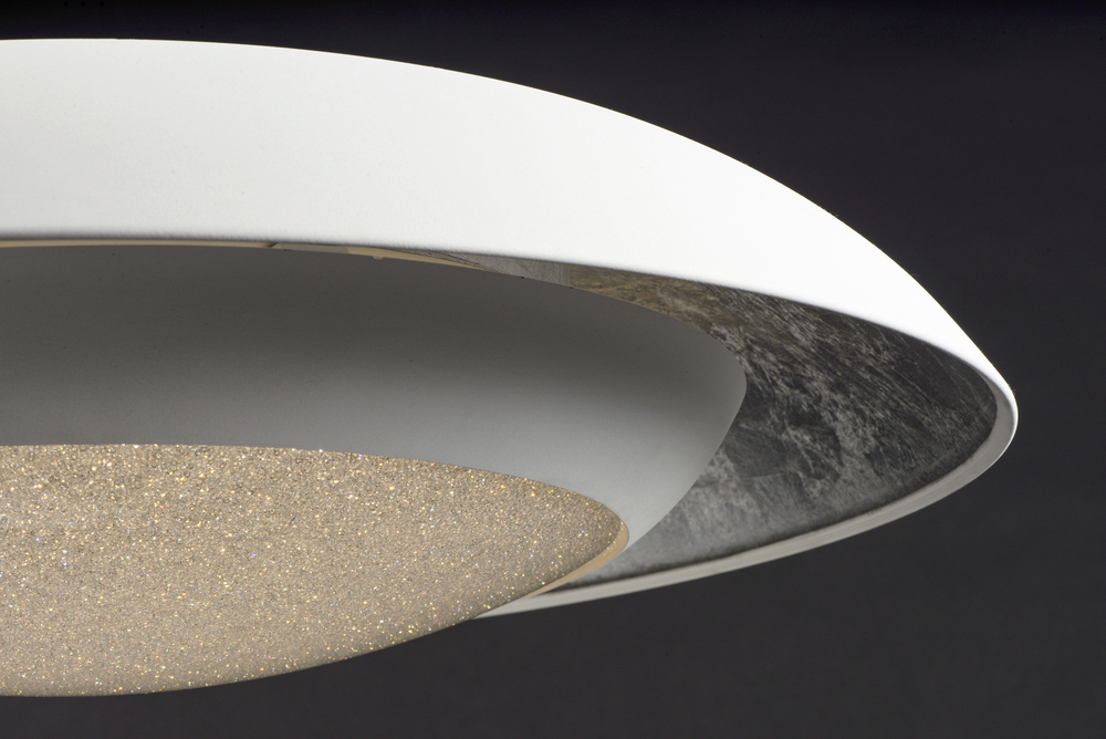 Domes of metal house a circular light engine housing with a Crystaline diffuser. A dramatic lighting effect is created with in-direct light highlighting the foil lining while direct light shines through the sparkling center. Available in your choice of Whi