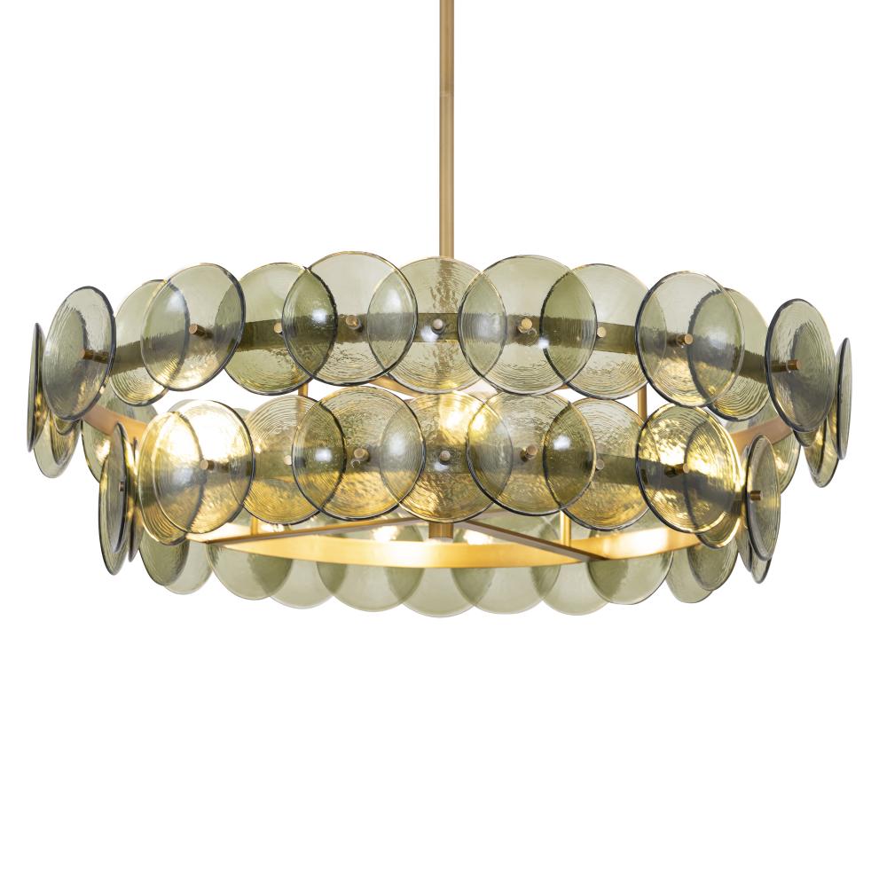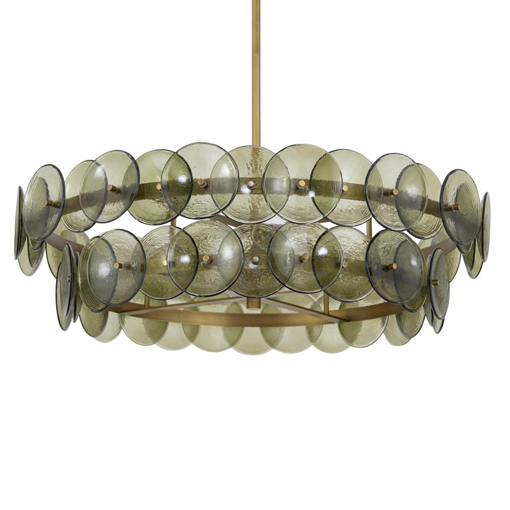 Overlapping handmade pressed glass disks mounted on metal frames inspired by Mid-Century Italian design, this collection offers a blend of vintage charm and modern elegance. Choose from Vintage Green glass on a Weathered Brass frame, or Amber glass on a Gu