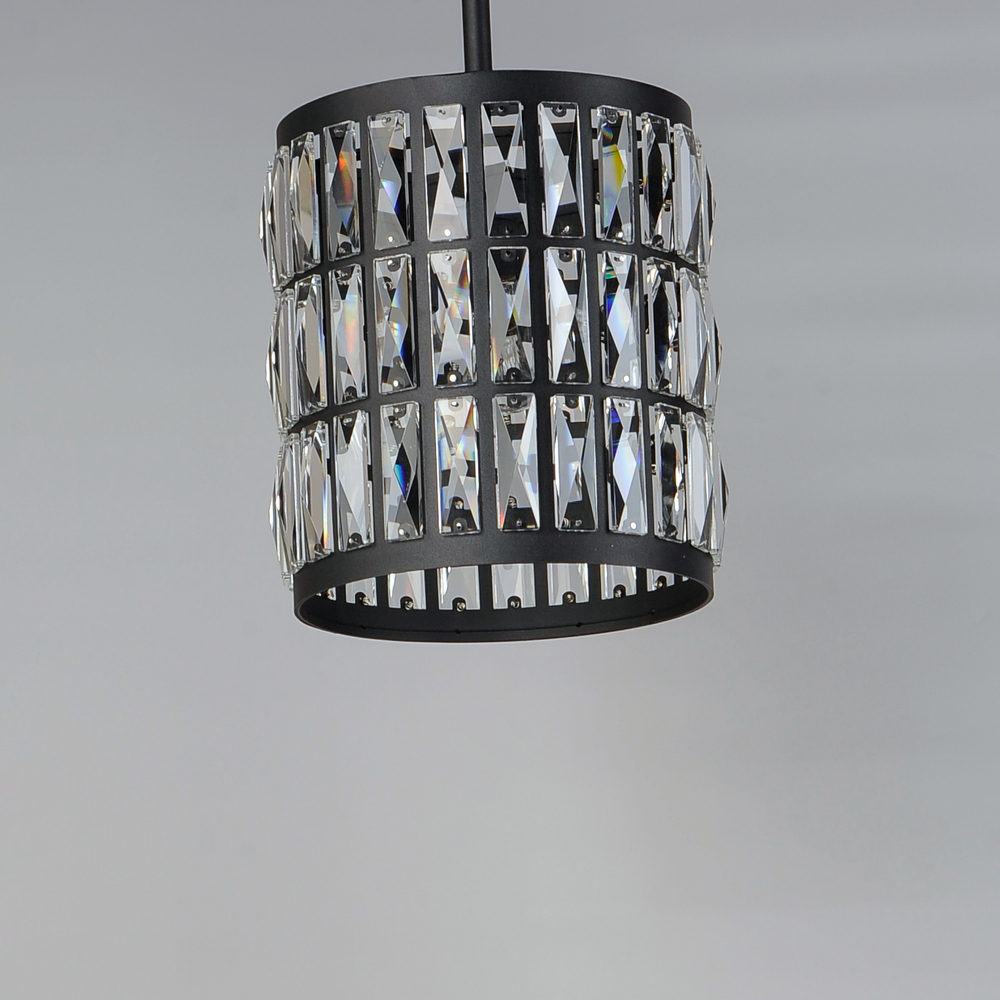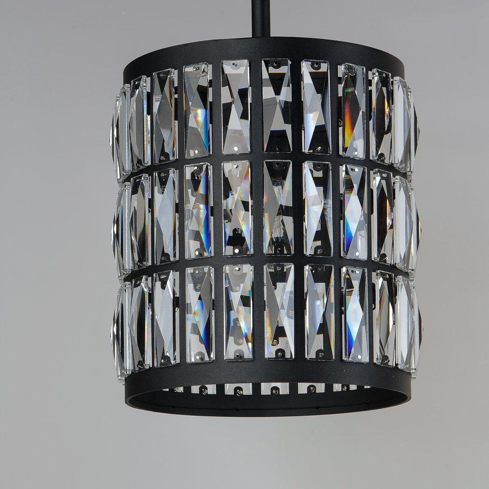 Rectilinear Beveled Crystals bejewel a Matte Black frame creates stark contrast to this radiantly prismatic display of light. The bound crystal is fixed to the frame to reduce time spent dressing the fixture.