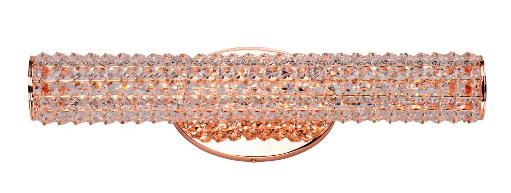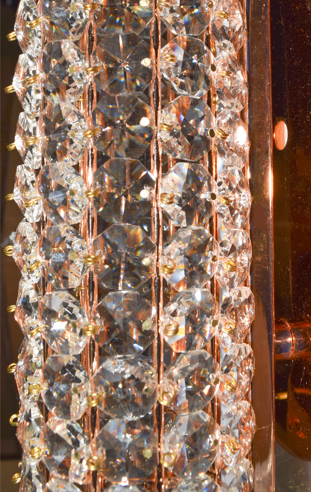 Clear Beveled Crystals are strung onto a continuous wire and wrapped over a tubular metal frame finished in your choice of a high luster Polished Chrome or vibrant Rose Gold. Hidden within the tubular frame is a LED light source, which not only adds beauty