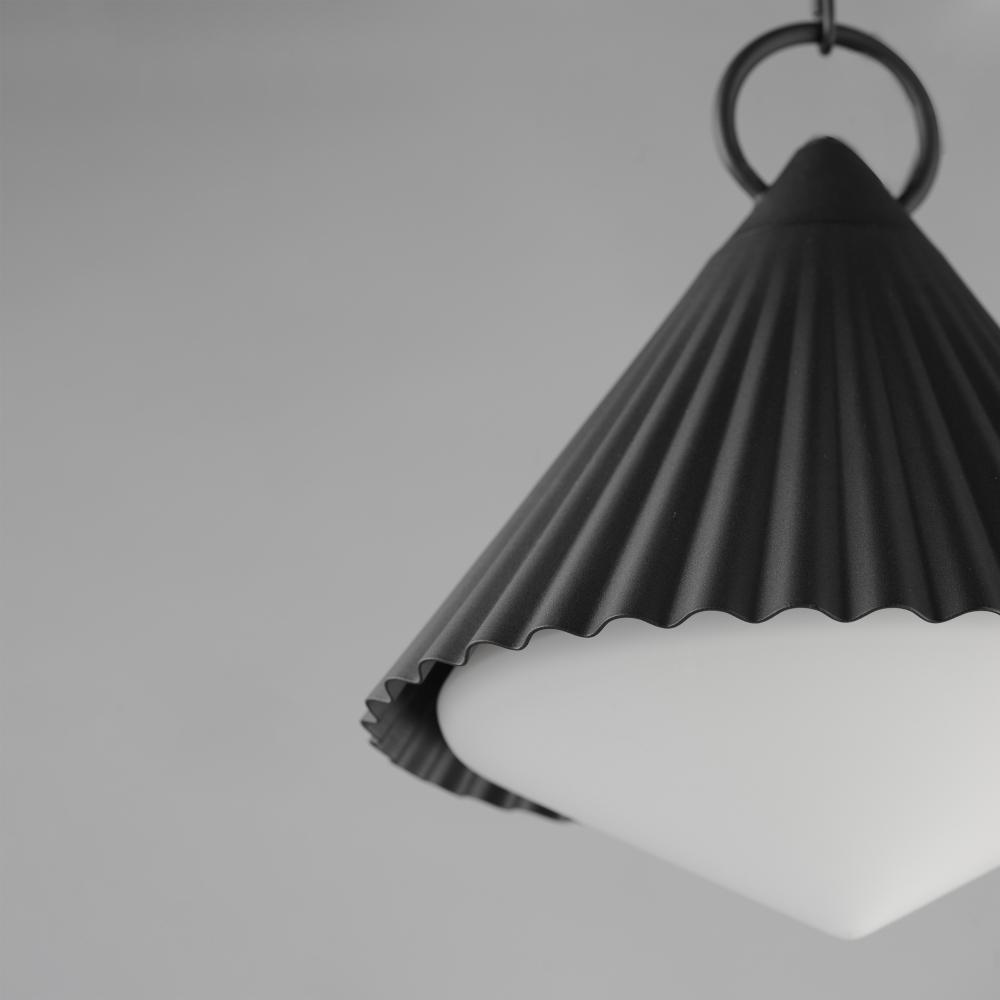 Adding charm to the outdoors, the Odette series features a scalloped pyramid shade suspended from a ring of Die Cast Aluminum. Supported within the shade is an inverse pyramid that peaks out beneath the hem of the aluminum shade marrying the two pyramid fo