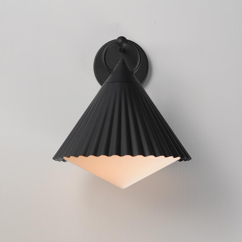 Adding charm to the outdoors, the Odette series features a scalloped pyramid shade suspended from a ring of Die Cast Aluminum. Supported within the shade is an inverse pyramid that peaks out beneath the hem of the aluminum shade marrying the two pyramid fo