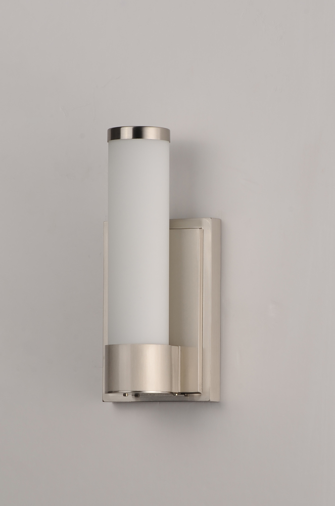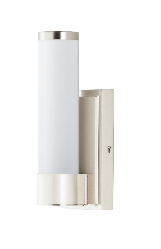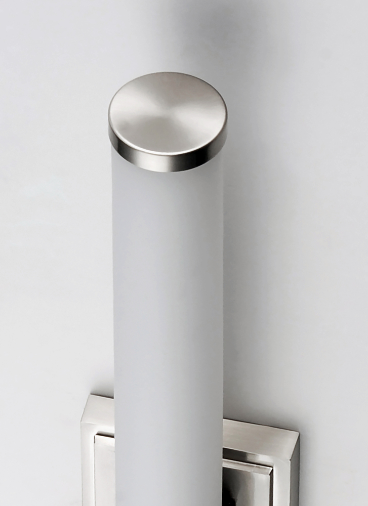 Cylinders of White cased glass are mounted onto a cast aluminum frame of Satin Nickel or Polished Chrome. LED modules evenly illuminate and provide soft yet ample illumination. Multi volt input is standard which allows for installation into commercial appl