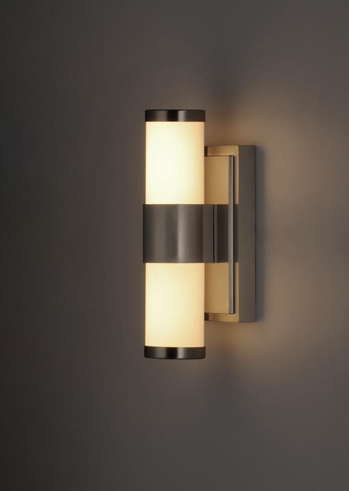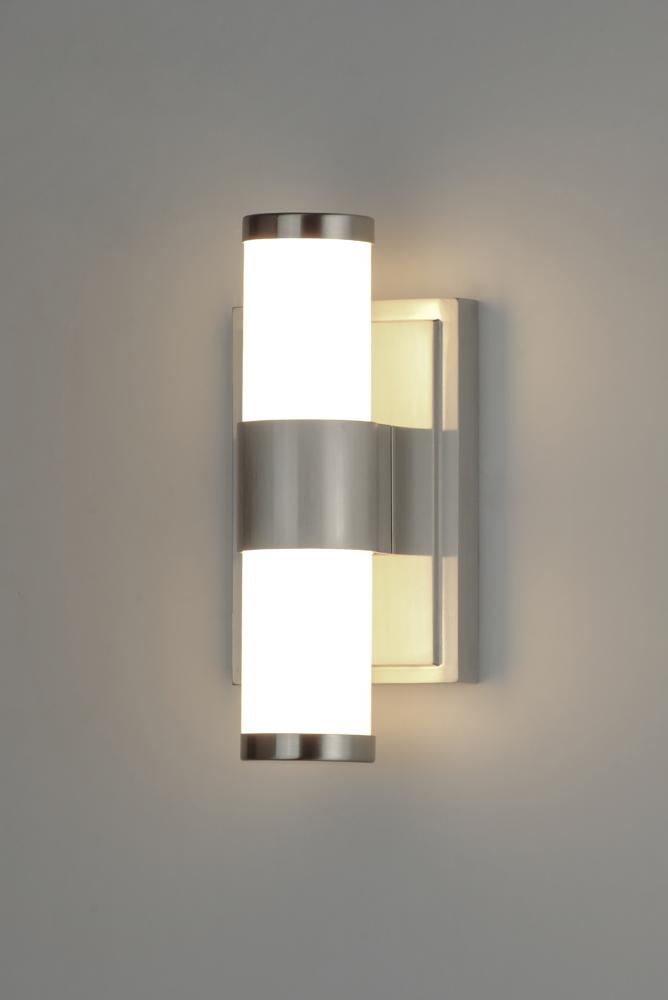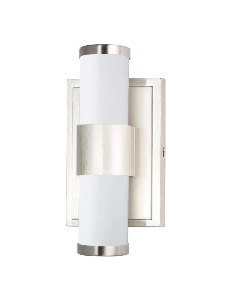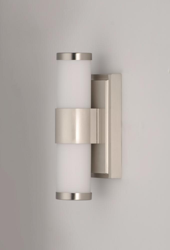 Cylinders of White cased glass are mounted onto a cast aluminum frame of Satin Nickel or Polished Chrome. LED modules evenly illuminate and provide soft yet ample illumination. Multi volt input is standard which allows for installation into commercial appl
