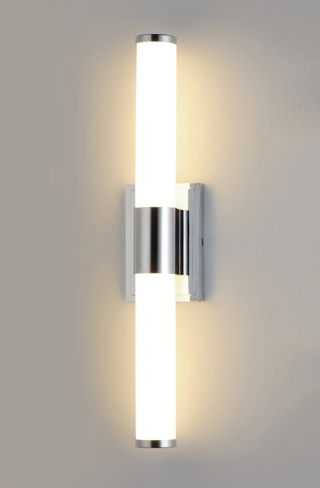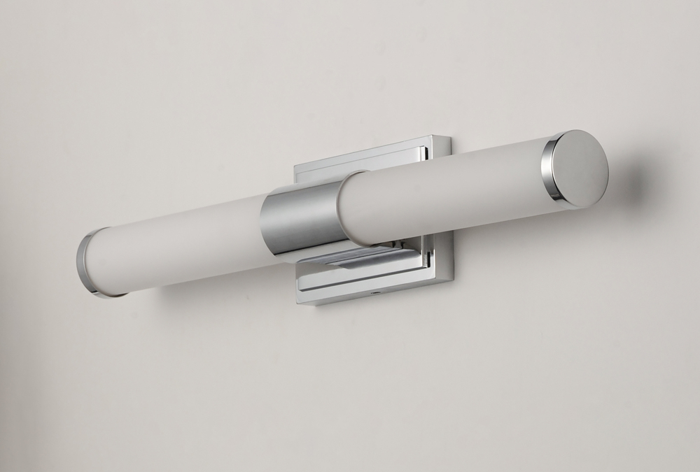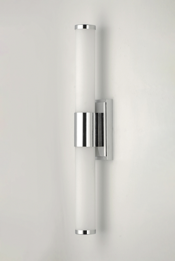 Cylinders of White cased glass are mounted onto a cast aluminum frame of Satin Nickel or Polished Chrome. LED modules evenly illuminate and provide soft yet ample illumination. Multi volt input is standard which allows for installation into commercial appl