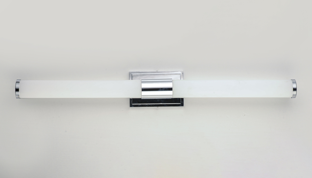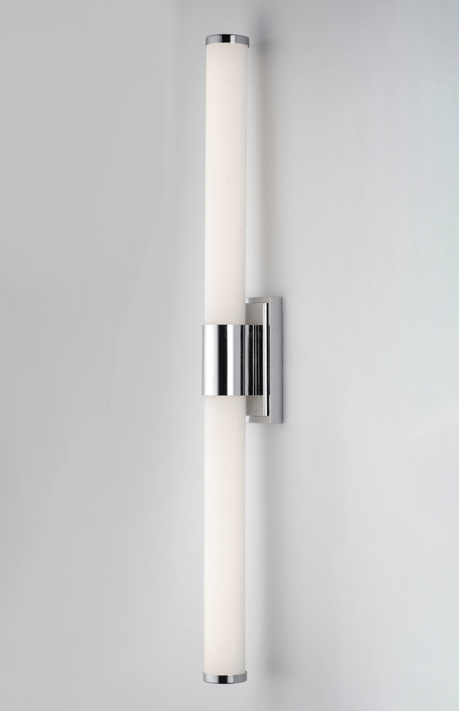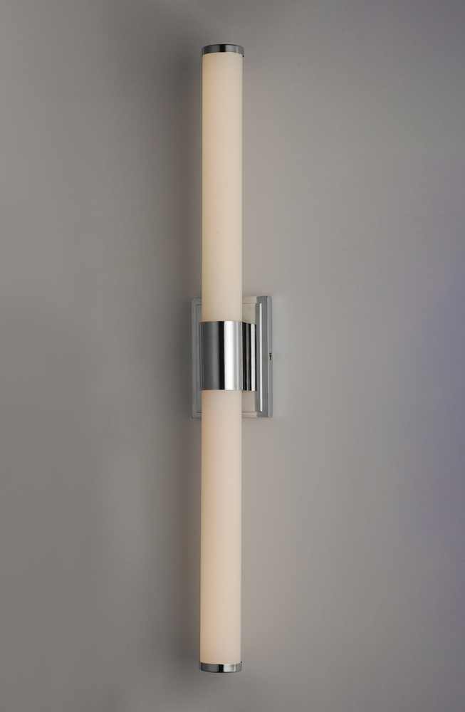 Cylinders of White cased glass are mounted onto a cast aluminum frame of Satin Nickel or Polished Chrome. LED modules evenly illuminate and provide soft yet ample illumination. Multi volt input is standard which allows for installation into commercial appl
