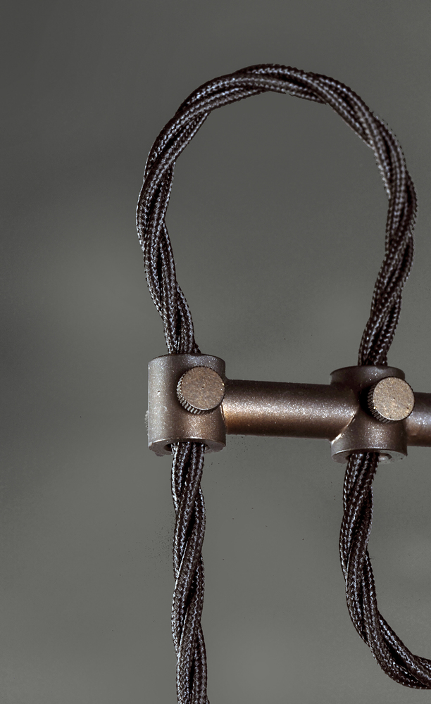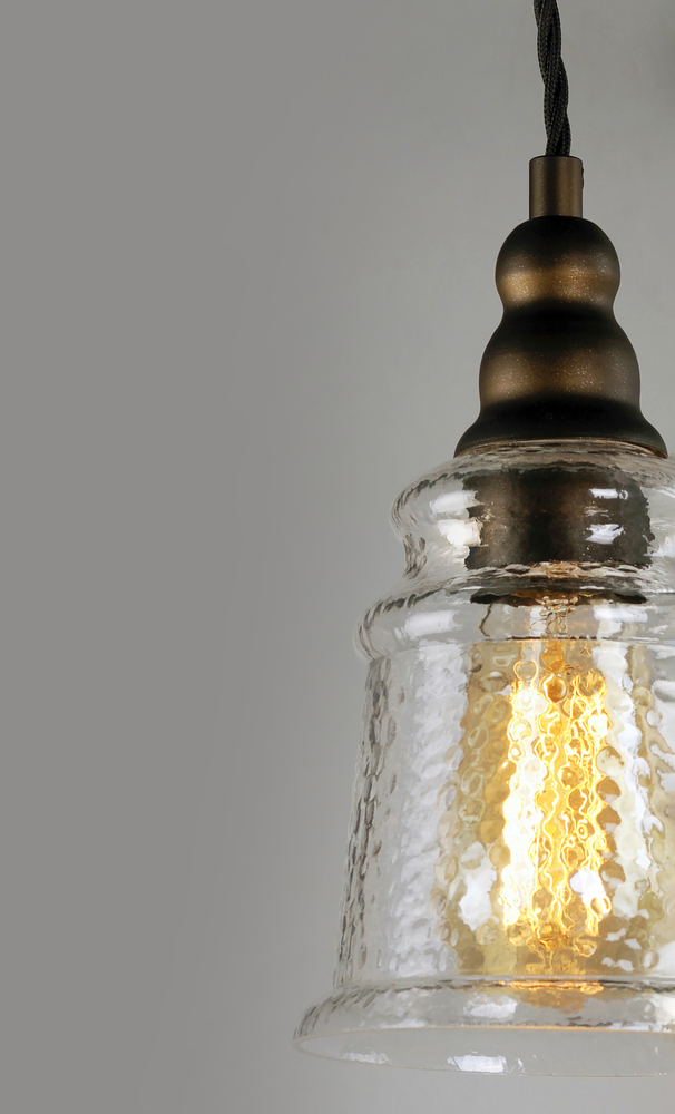 Metal frames of Oil Rubbed Bronze are draped with a twisted fabric wire for that authentic detail. Clear Hammered glass shades suspend from the twisted wire reminiscent of yesteryear. The restoration style of this collection lives on forever.