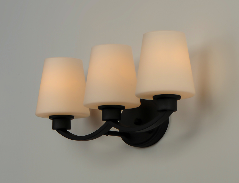 Graceful arcs of rectangular tubing transition to round cups that support tapered Satin White glass shades creating a crisp and clean transitional design. The frame is finished in your choice of Satin Nickel or Black which bridges modern and transitional d