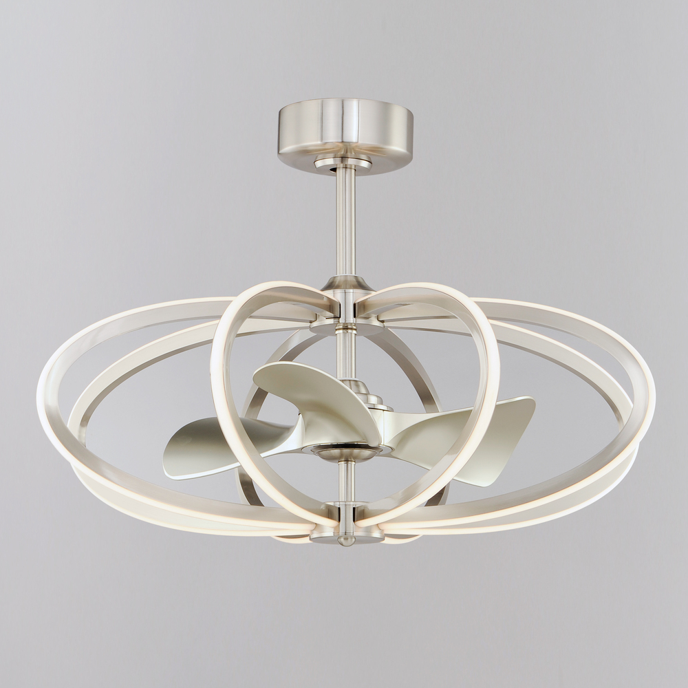 The Solstice Fandelight houses a Wifi-enabled fan within a cage of artfully bent Satin Nickel channels to create a classic form in light. The Smart control functions operate both the fan and the light itself. Adjust the color temperature and light intensit