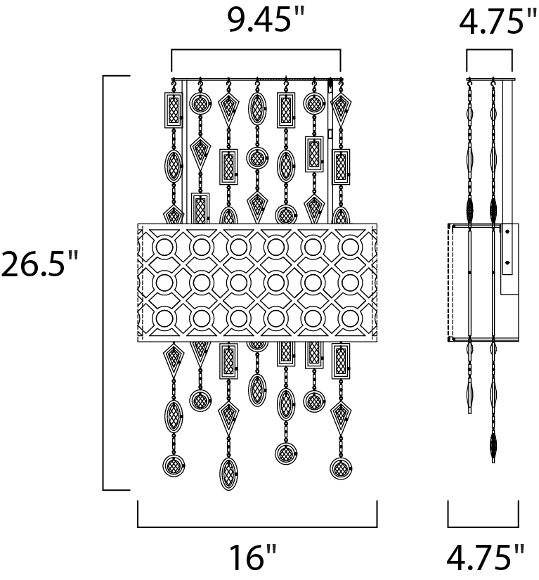 A geometric pattern in a frame of Stainless Steel finished in Polished Nickel is contrasted by an inner Slate fabric shade. Geometric shaped cast pendants frame custom-made crystals, adding brilliant accents throughout the fixture.