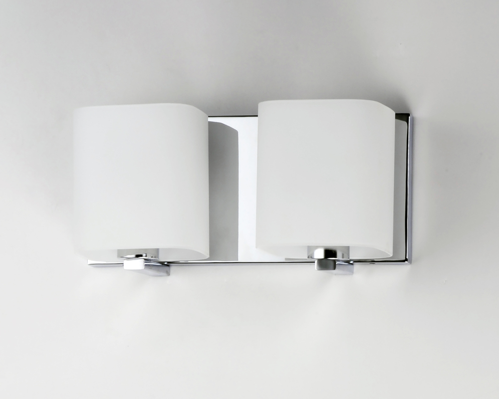 Satin White bands of cased glass wrap around each lamp creating a soft ribbon of light. Back plates finished in Polished Chrome or Satin Nickel complement the majority of bath fittings.