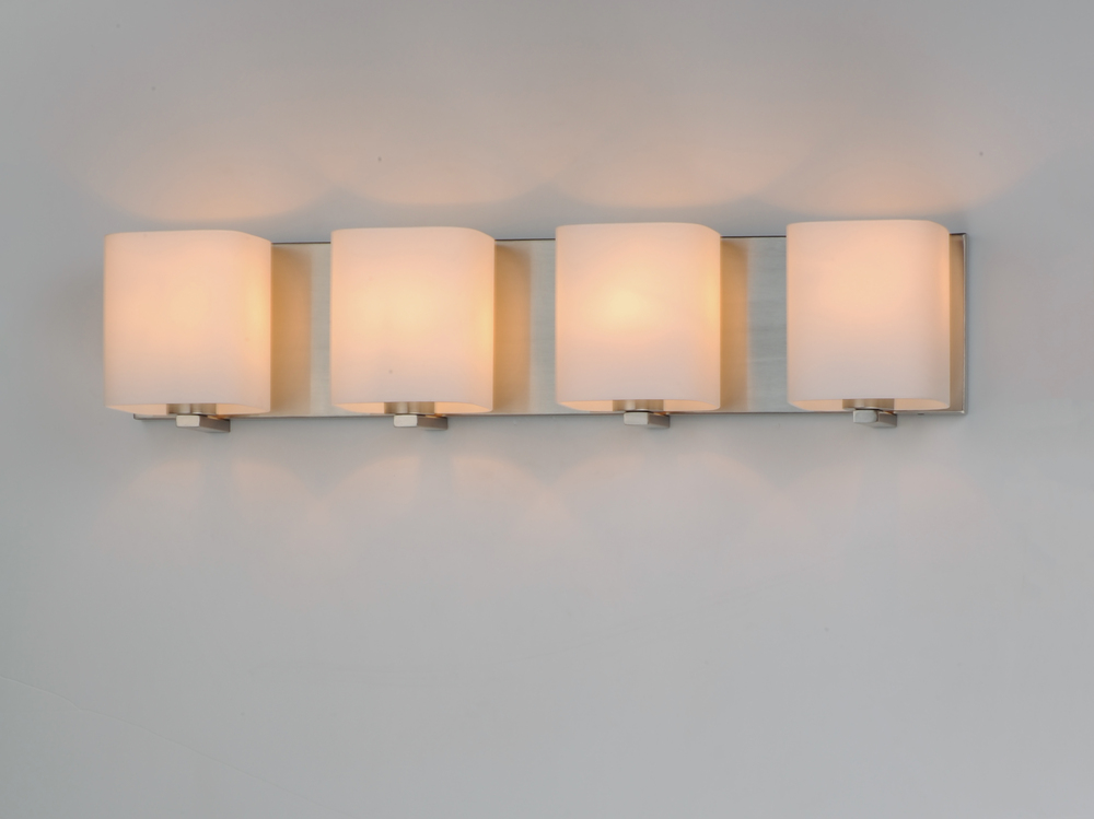Satin White bands of cased glass wrap around each lamp creating a soft ribbon of light. Back plates finished in Polished Chrome or Satin Nickel complement the majority of bath fittings.