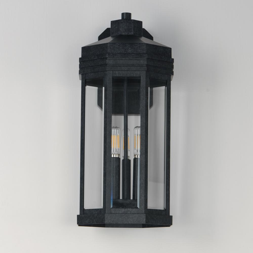 Inspired by the intricate geometric motifs of the iconic architect, the Wright collection of outdoor lighting features a hexagonal frame with tiered louvers along its hood. Beveled at its edges, the Clear glass panes encase the lighting cluster within a ro