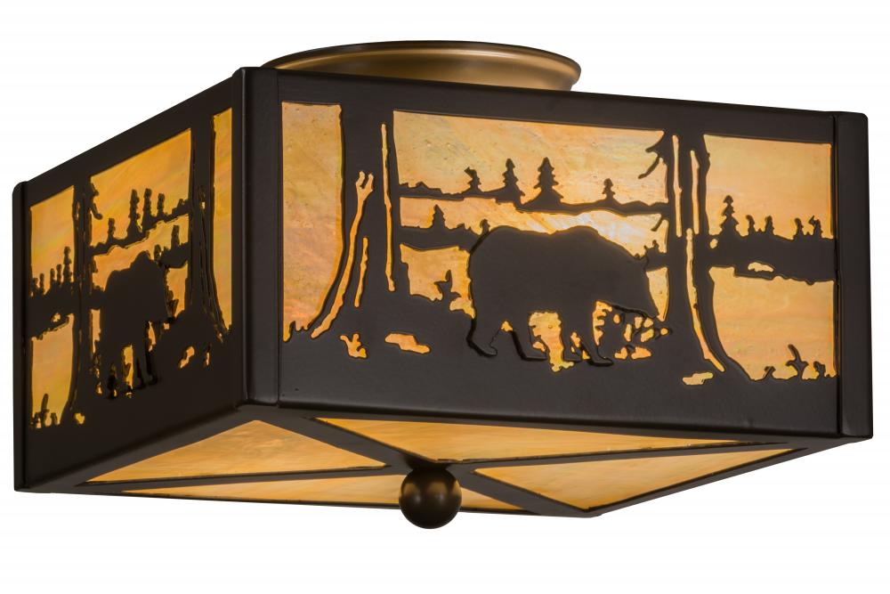 Drawing inspiration from the wildlife and natural beauty in the nearby Adirondack Mountains; this stunning lighting fixture depicts a Majestic Bear wandering around a woodland lake. A warm ambient glow projects through warm Beige Iridescent glass; which is complemented with a frame and hardware featured in a Timeless Bronze finish. The fixture is handcrafted by Meyda artisans in our Yorkville; NY facility. Custom designs; finishes; styles; sizes and dimmable energy efficient lamping are available. This flushmount is UL and cUL listed for damp and dry locations.