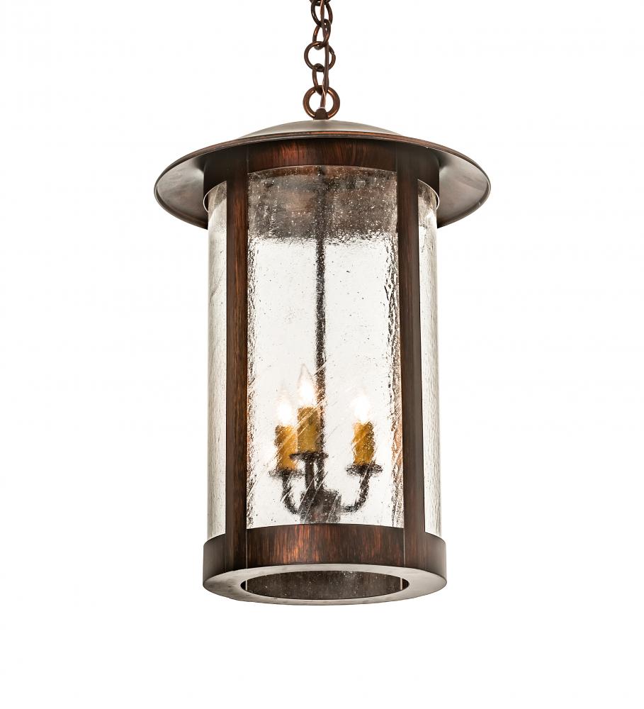 Handcrafted with unique beauty for both interior and outdoor lighting applications. This stunning cylindrical shaped Brass lantern features a Clear Seeded Glass lens that reveals three Ivory faux candlelights. The pendant is enhanced with a unique Rokusho finish. Overall height ranges from 26 to 40 inches as chain length can be easily adjusted in the field. The Lake Charles Pendant is featured in our American made; American designed; handcrafted Craftsman Signature Series. Manufactured in Yorkville; New York. UL and cUL listed for dry; damp and wet locations.
