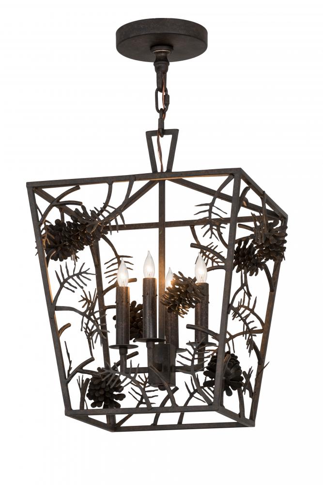 A sophisticated architecturally styled fixture is combined with a rustic nature inspired design. Give your decor an extra edge with this breathtaking pendant; which is highlighted with a Chestnut-finished structure that encases four faux candlelights perched on bobeches. Exquisite steel pinecones with pine needles accent each side of this unique pendant. Handmade in our 180;000 square foot manufacturing facility in Yorkville; New York. Available in custom sizes; styles and finishes; as well as dimmable energy efficient lamping options. UL and CUL listed for damp and dry locations.