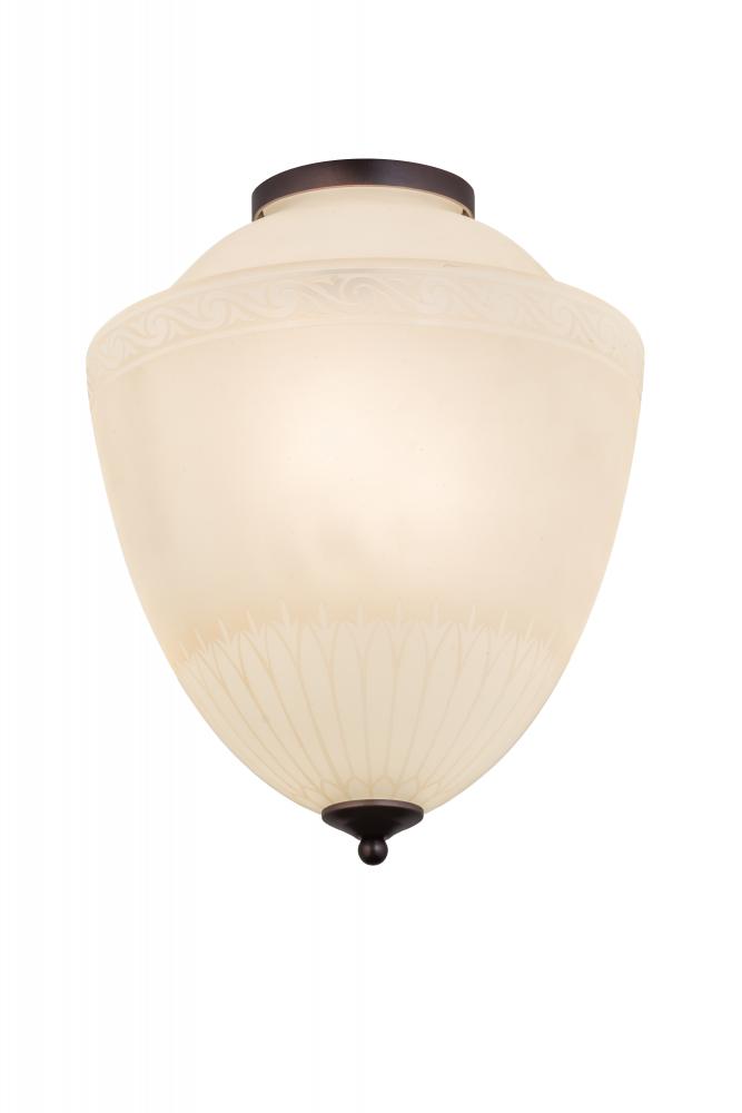 Charmingly reminiscent of classic lighting; Ovum Aquinum is the ideal choice for classic and eclectic decor. The fixture features rich White Opal art glass highlighted with an etched design featuring lovely floral petals on the bottom and crowned with a trim echoing gentle cresting waves. The shade is enhanced with hardware and a finial featured in a warm Mahogany Bronze finish. The fixture is available in custom sizes; colors and finishes; as well as dimmable energy efficient lamping options. UL and cUL listed for damp and dry locations.