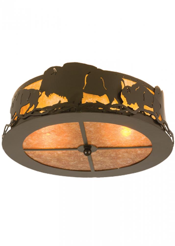 The majestic Buffalo is depicted on this flushmount. Illuminated through Amber mica panels; the fixture has a Timeless Bronze finish and is handcrafted in the USA by Meyda artisans.