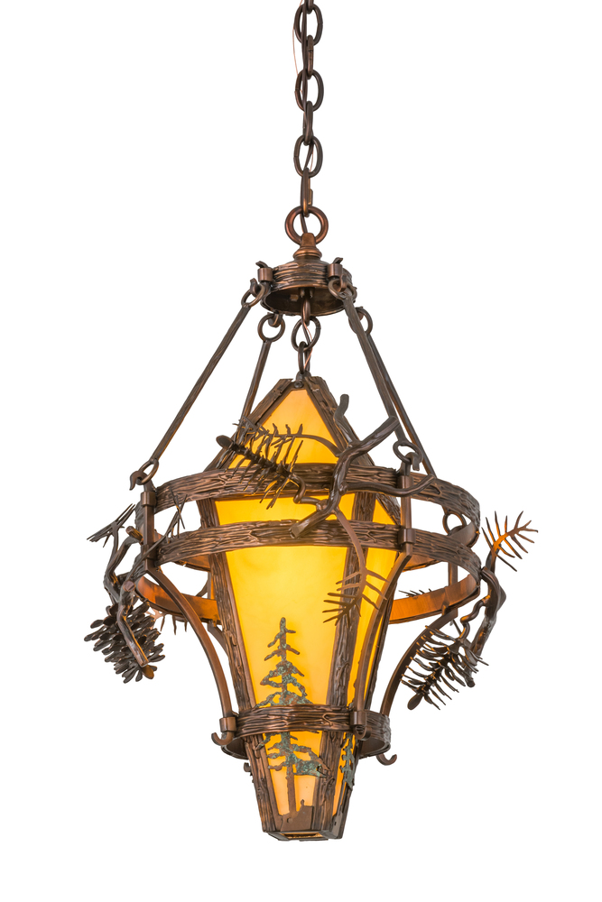 This nature inspired lighting pendant features stunning Pinecones and Pine Needles in a Vintage Copper finish; along with handpainted Green Pine Trees. The decorative accents and hardware enhance a stunning Tawnyrock Idalight diffuser. The fixture; which is ideal for illuminating any room in a home; business or other commercial setting; is handcrafted by Meyda artisans in the USA; at the foothills of the spectacular Adirondack Mountains. Custom sizes; styles and colors are available; as well as dimmable energy efficient lamping options. The pendant is UL and cUL listed for damp and dry locations.