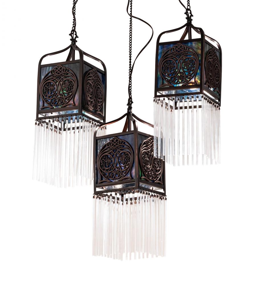 Inspired by Celtic Vines and Floral artwork. This Cascading Pendant features three dramatic Celtic Knot Lanterns. A stunning piece of craftsmanship; Mahogany Bronze overlays elegant art glass featuring Purple; Blue; Orange and Green on each shade. The Clear Fringe adds a nice touch to this hanging fixture which is enhanced with a Mahogany Bronze finish. Ideal for making a design statement in an entryway and other spaces in residential and hospitality settings. UL and cUL listed for dry and damp locations. Each shade is a unique work of art with color variations based on natural ingredients inherent in the glass. Contact us if color matching is critical when ordering multiple items.