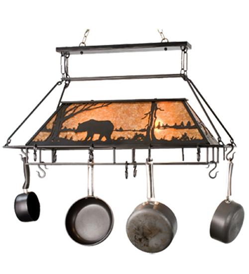 This handsome lighted pot rack features a Black Bear in a Pine forest. This rustic fixture is finished in Textured Black with Amber mica panels; and is handcrafted in the USA by Meyda artisans.