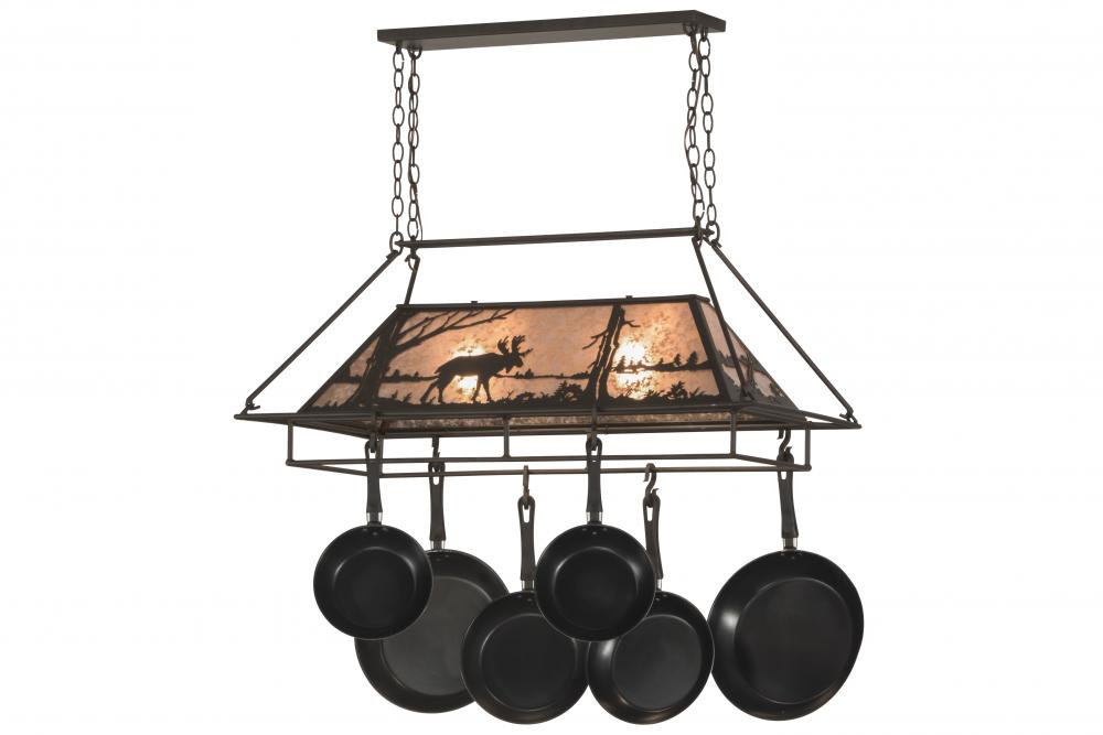 The majestic Moose wanders near a woodland lake as the morning sun rises in the background. This wildlife inspired; multifunctional fixture provides ambient lighting through a Silver Mica diffuser while featuring an Oil Rubbed Bronze finished frame with hooks to display pots and pans for easy access in kitchens. Handcrafted in the USA by Meyda artisans at the foothills of Upstate New York's Adirondack Mountains.