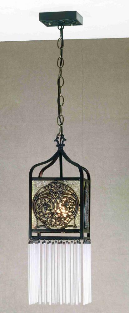Inspired by Celtic Vines and Floral artwork. This dramatically designed Celtic Knot Lantern is a stunning piece of craftsmanship as Mahogany Bronze overlays are highlighted on elegant Clear Waterglass. The Clear Fringe adds a nice touch to this hanging wall fixture. The fixture is enhanced with a Mahogany Bronze finish. Group these mini pendants over a kitchen island; counter or bar to make an alluring design statement. UL and cUL listed for dry and damp locations. Each shade is a unique work of art with color variations based on natural ingredients inherent in the glass. Contact us if color matching is critical when ordering multiple items.