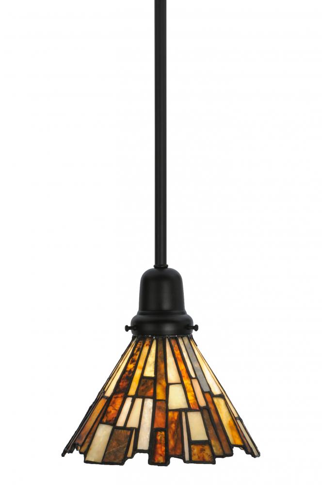 Thinly hand carved and polished natural Jadestone in earthy tones of Moss Green; Tan; Natural Ivory and Coral become luminescent in this unique tile patterned pendant shade and complemented with hardware finished in Solar Black. The natural stone shade is crafted using the famous copperfoil construction process that creates Tiffany stained glass lamps and fixtures.