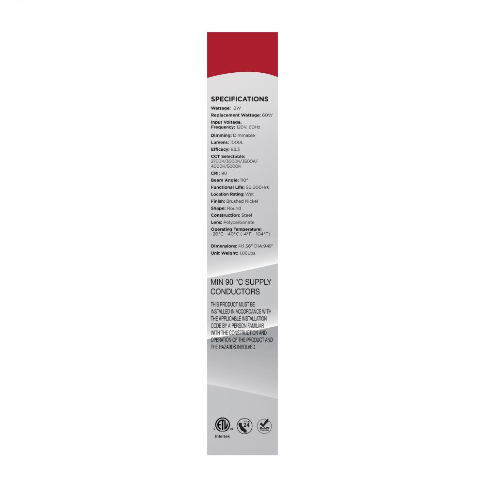 Designed for larger spaces, SATCO NUVO's 62-1812R1, 10" CCT Selectable Disk Light in a brushed nickel finish delivers powerful, customizable illumination with a sleek, low-profile look. Consuming just 12 watts, this high-performance fixture feature