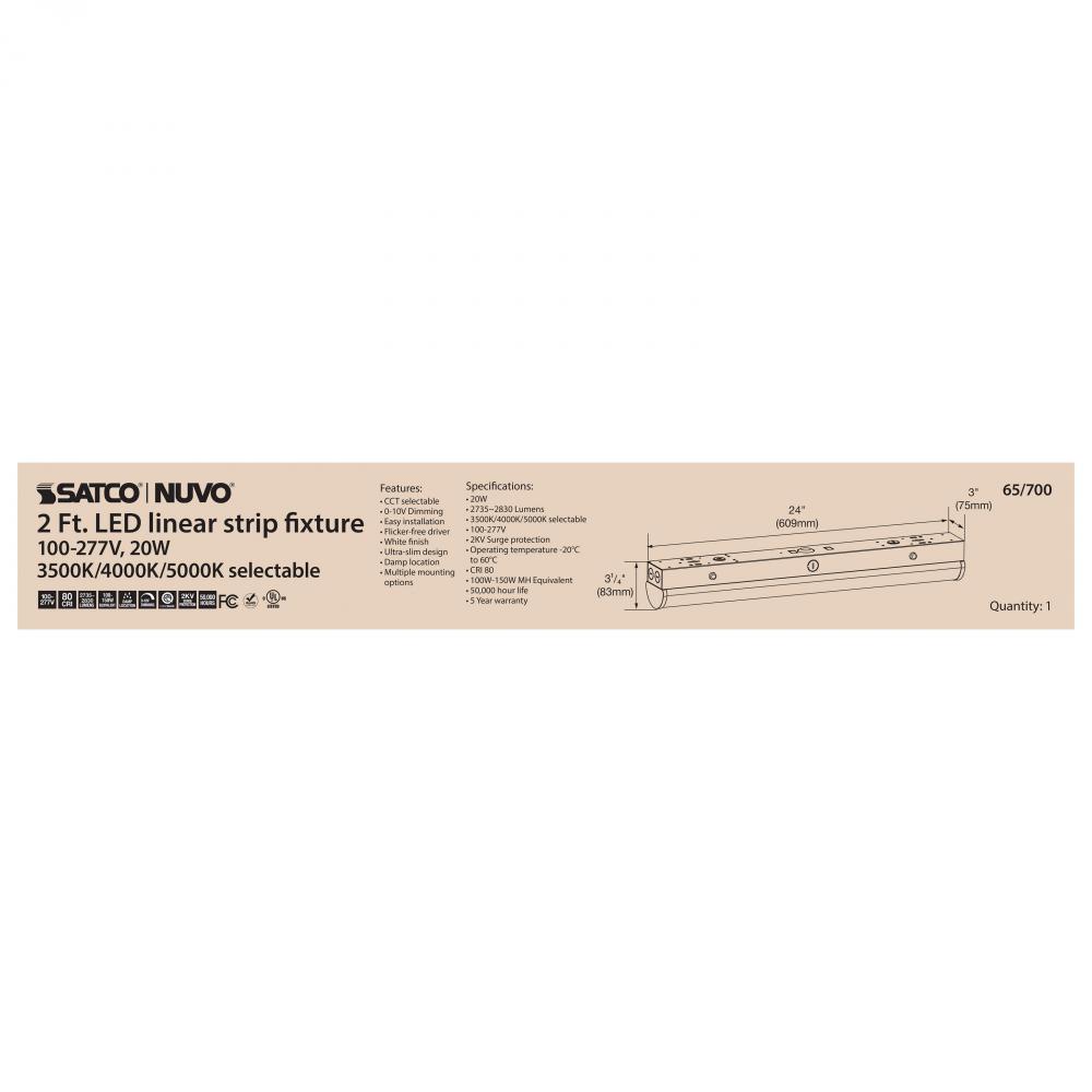 Introducing another addition to our LED strip lights line. SATCO NUVO's 65-700 is a new cULus listed 20-Watt, 2-foot strip addition is CCT selectable (3500K/4000K/5000K) with a voltage range of 100-277 volts, and is 0-10 volt dimmable. It has a flicker