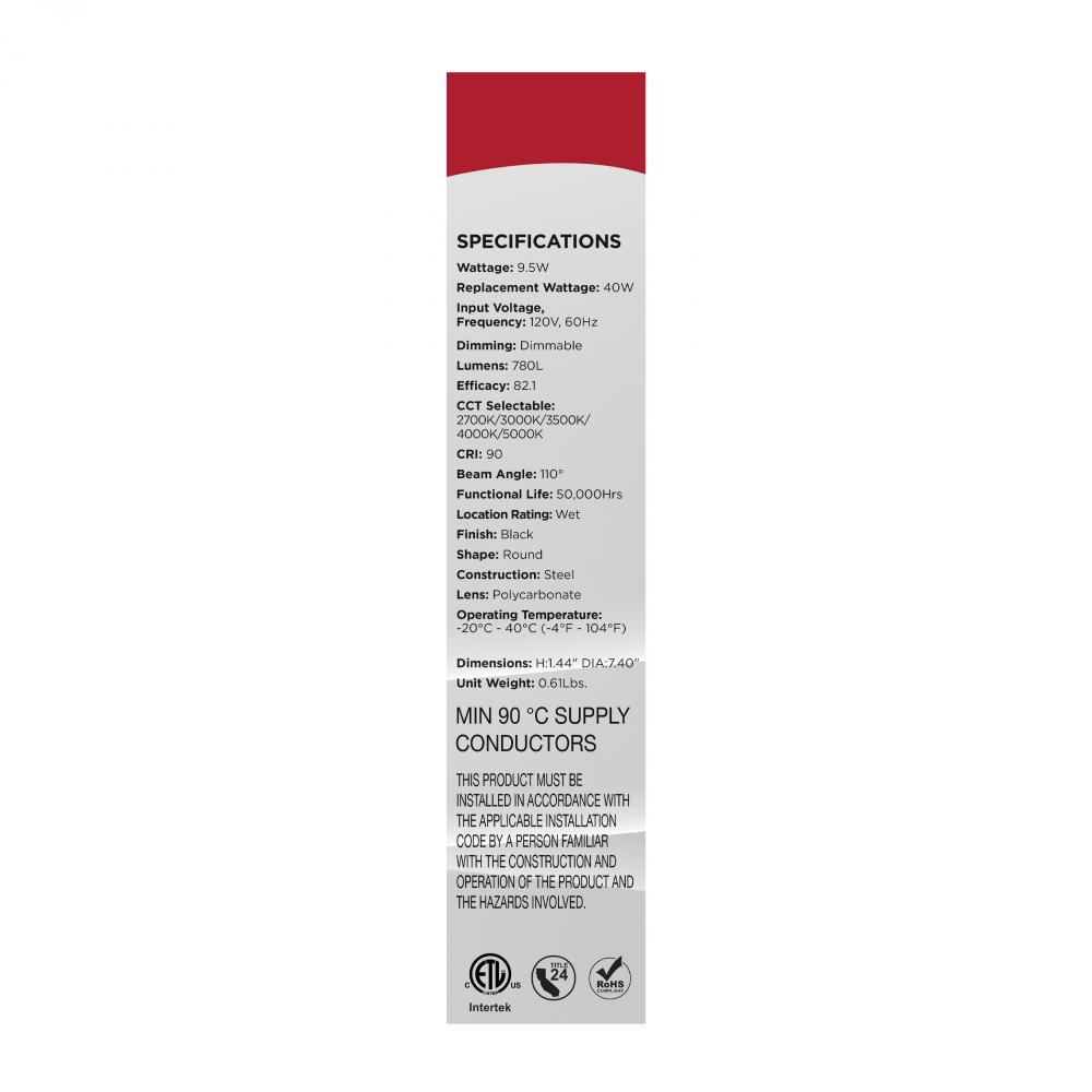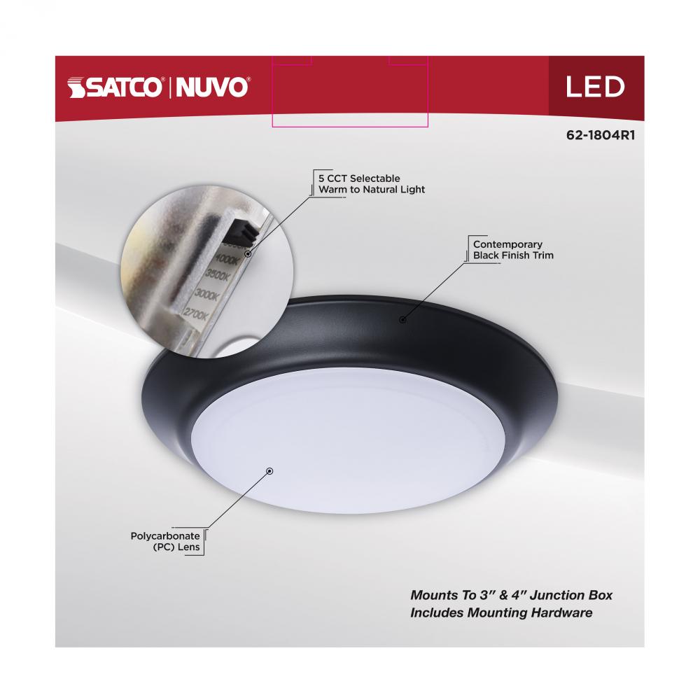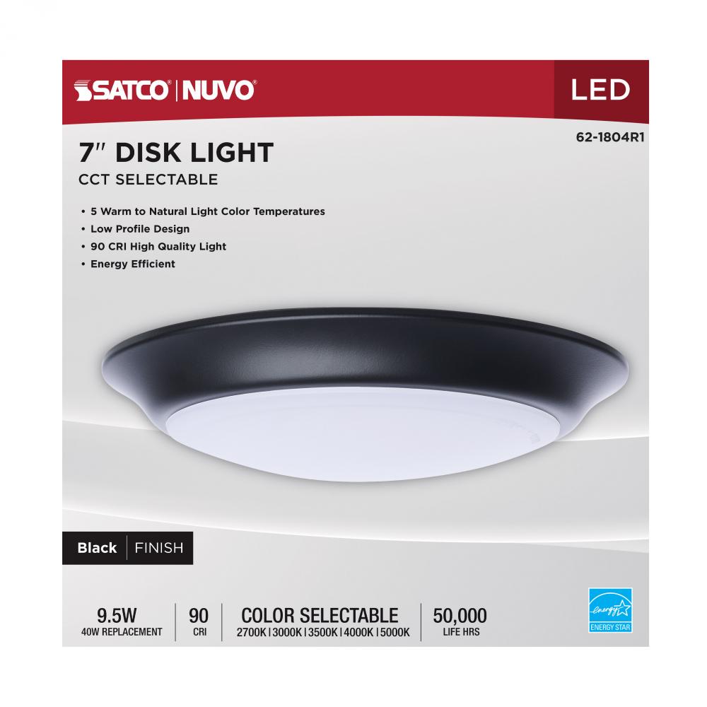 Bring style and performance to your space with SATCO NUVO's 62-1804R1, 7" CCT Selectable Disk Light in a black finish. Delivering 9.5 watts of energy-efficient illumination, this sleek fixture features five selectable color temperatures (2700K–50