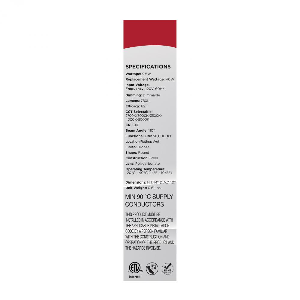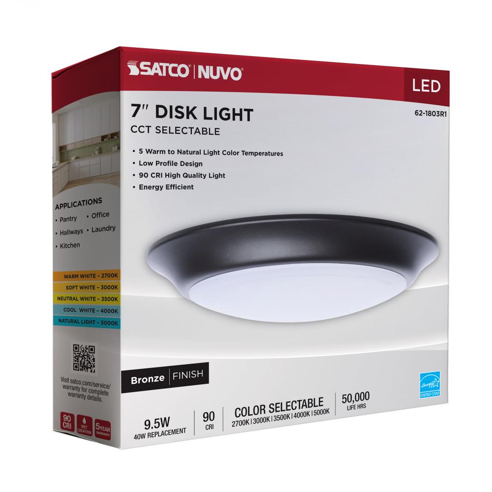 Bring style and performance to your space with SATCO NUVO's 62-1803R1, 7" CCT Selectable Disk Light in a bronze finish. Delivering 9.5 watts of energy-efficient illumination, this sleek fixture features five selectable color temperatures (2700K–5