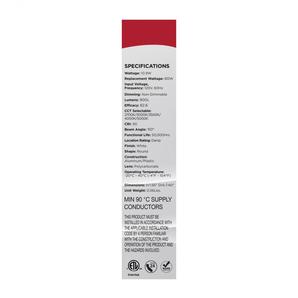 SATCO NUVO's white CCT Selectable Disk Lights deliver efficiency, convenience, and modern performance in 7" and 10" sizes. With five selectable color temperatures (2700K/3000K/3500K/4000K/5000K), these fixtures adapt to a wide range of lighting