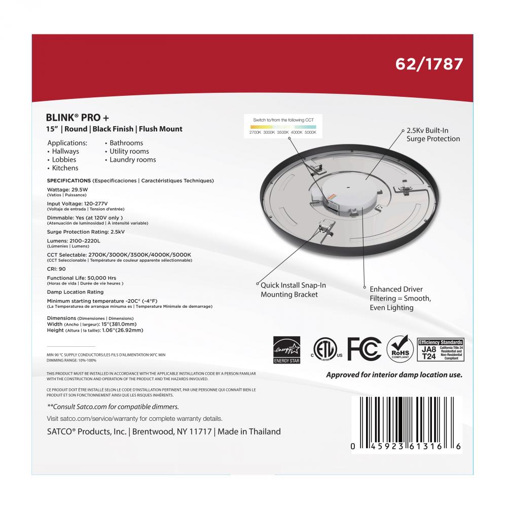 Blink Pro Plus; 29.5 Watt; 15 in.; Surface Mount LED; CCT Selectable; 90 CRI; Black Finish; 120/277 Volt; Round Shape