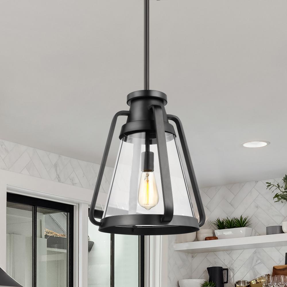 Glass and overlaying metal create a nice depth with the Everett 60-7553 medium pendant. The clear, tapered glass provides 360-degree illuminations. When paired with a vintage bulb, it creates a maritime-vintage style. A matte black finish on the fixture bo