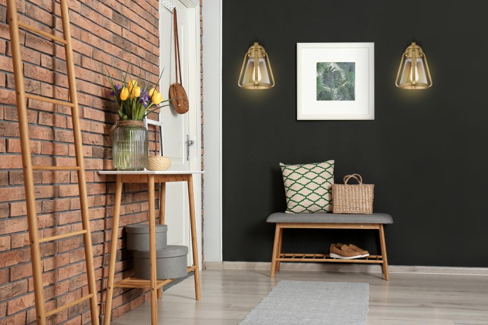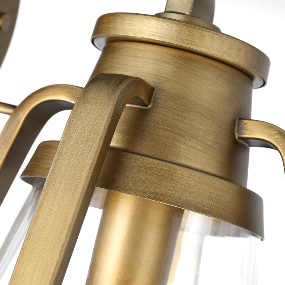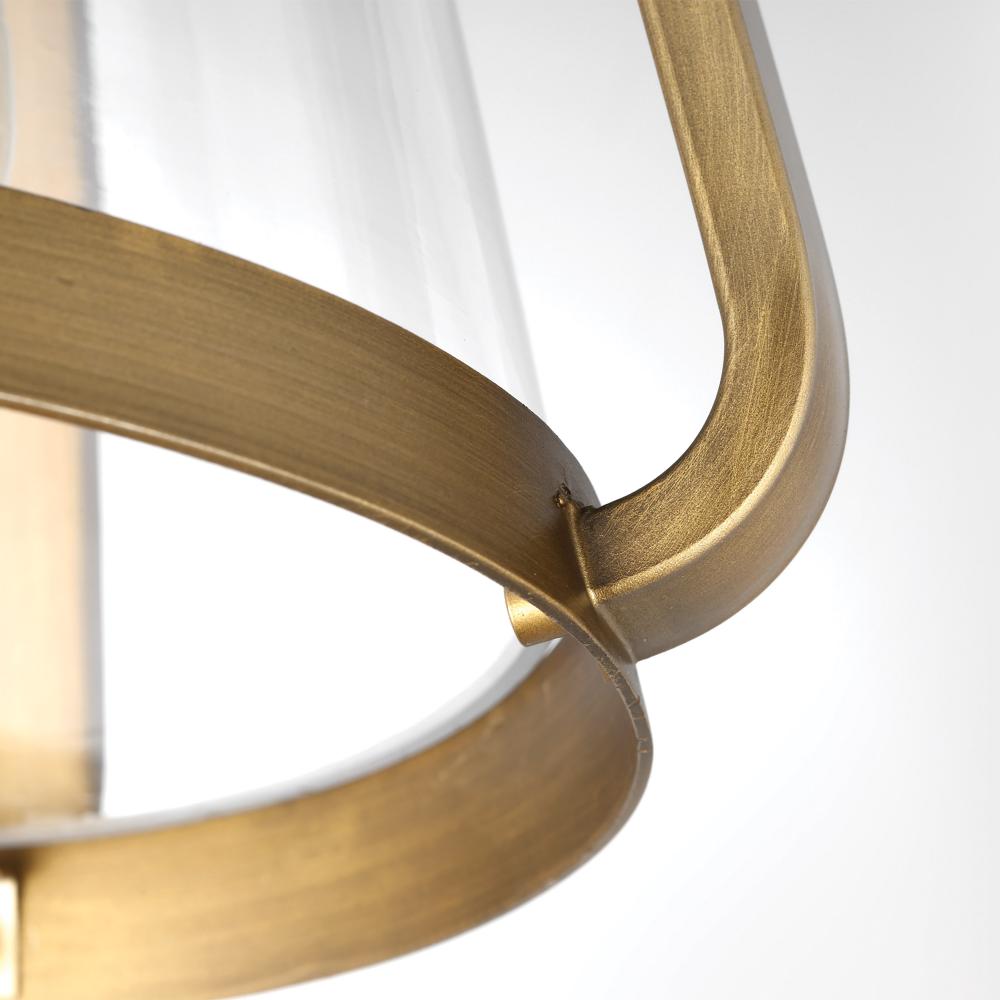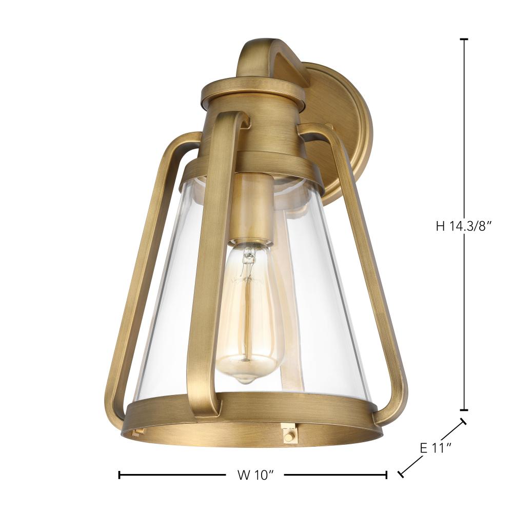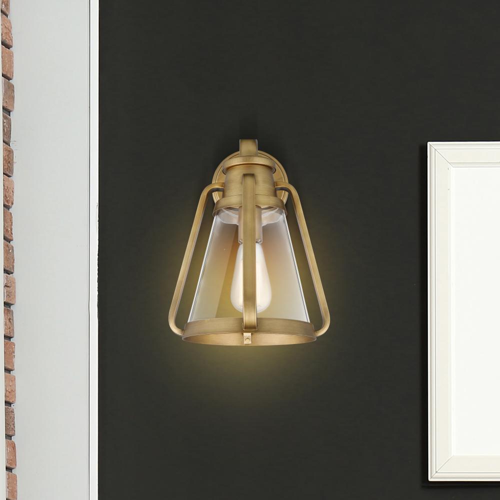 Glass and overlaying metal create a nice depth with the Everett large wall sconce. The clear, tapered glass provides 360-degree illuminations. When paired with a vintage bulb, a touch of nostalgia complements the transitional design. A natural brass finish