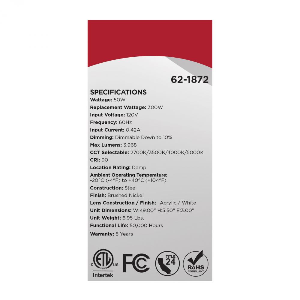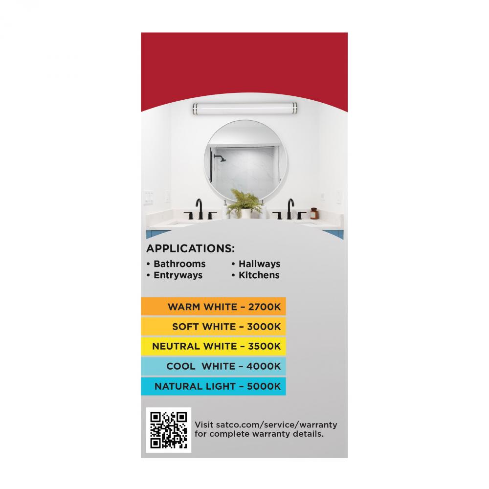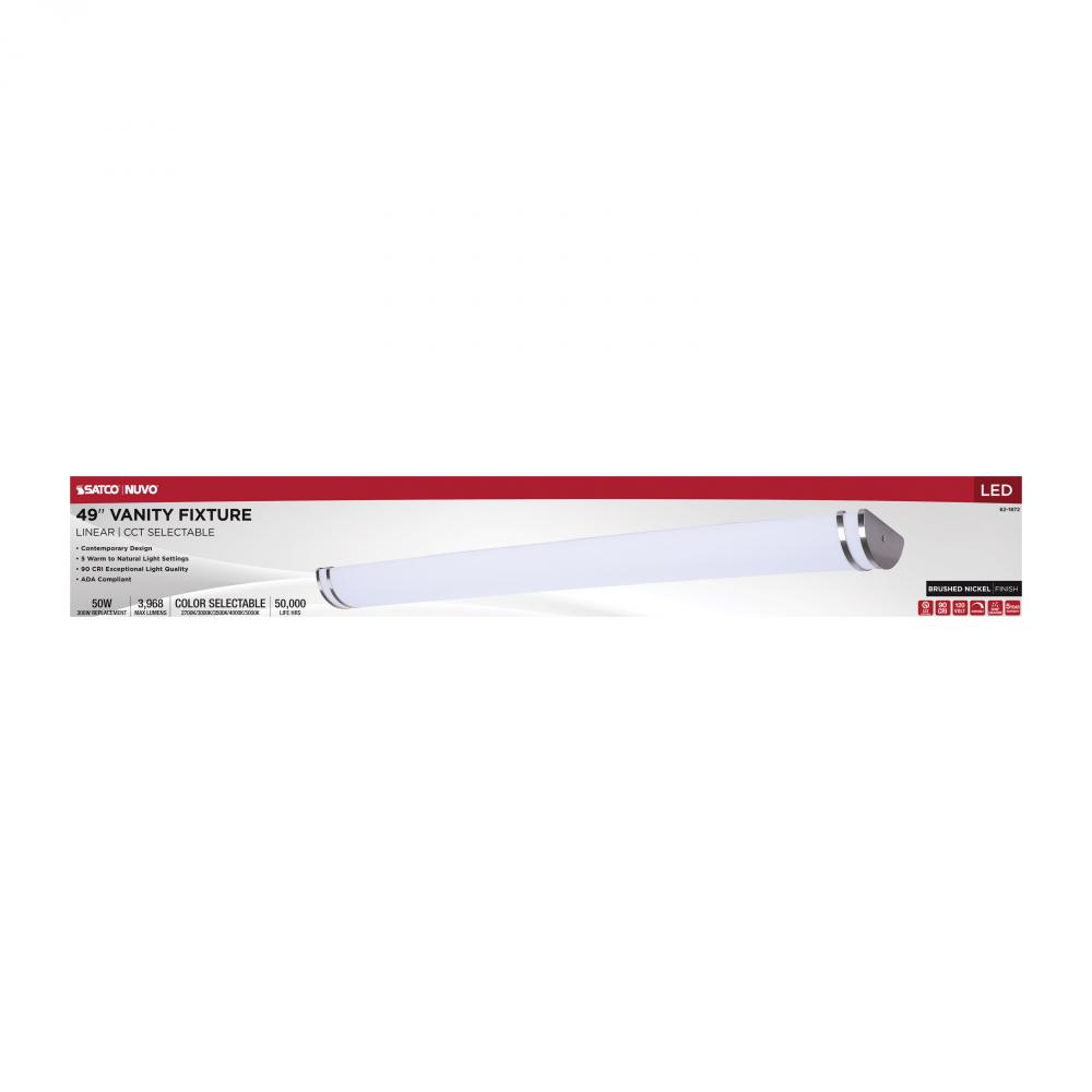 The SATCO NUVO 62-1872 Glamour 49-inch Vanity Fixture in Brushed Nickel combines sleek design with 5 CCT selectable technology (2700K–5000K) and 90 CRI illumination for superior color rendering. This 50-watt fixture replaces 300W incandescent lighting, o