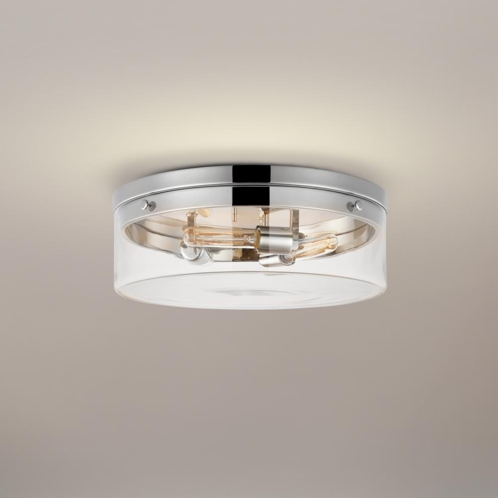 The blend of styles (modern, industrial and chic) is incorporated beautifully into the design of the Intersection large flush mount. The clear glass shade showcases vintage filament bulbs for a touch of nostalgia. The sleek, mirror-like, polished nickel wi