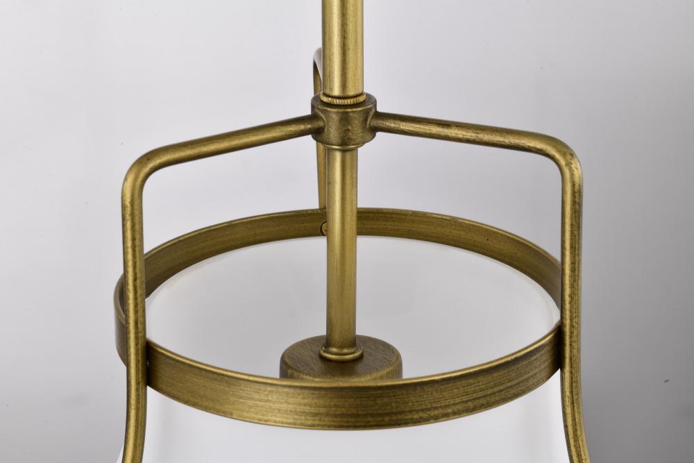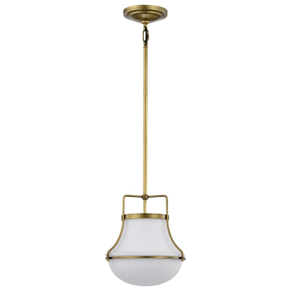 Evoke a sense of tranquility with the Valdora 60-7862 small pendant, which pays homage to classic, luminous illumination. A schoolhouse-inspired shade floats in a rich finish of natural brass, perfectly complimenting the fixture base and white hue of the g