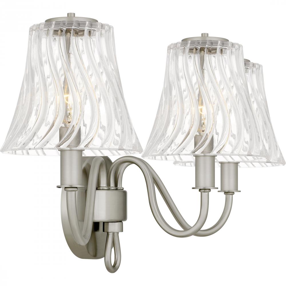 With its traditional styling and clean lines, McKinney is a perfect addition to any bathroom vanity setting. Choose from a brushed nickel finish with clear swirl glass or a matte black finish with etched swirl glass. The glass shades feature a fun twist de